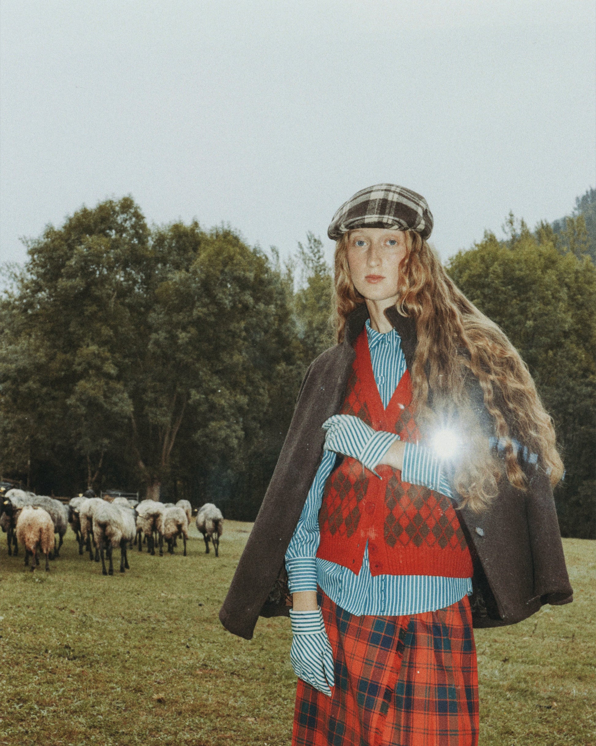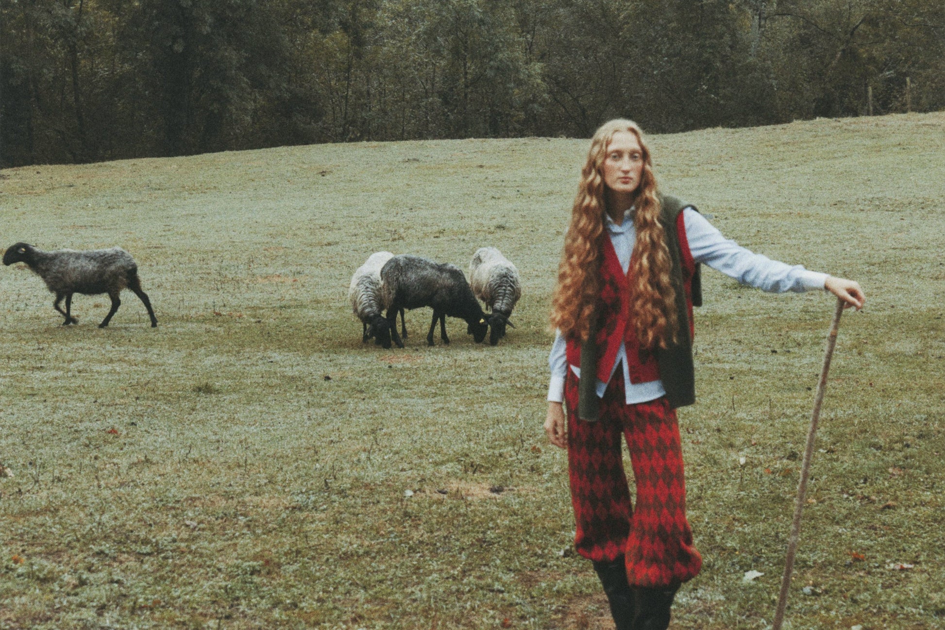 Red and brown argyle knitted vest with velvet-covered buttons.