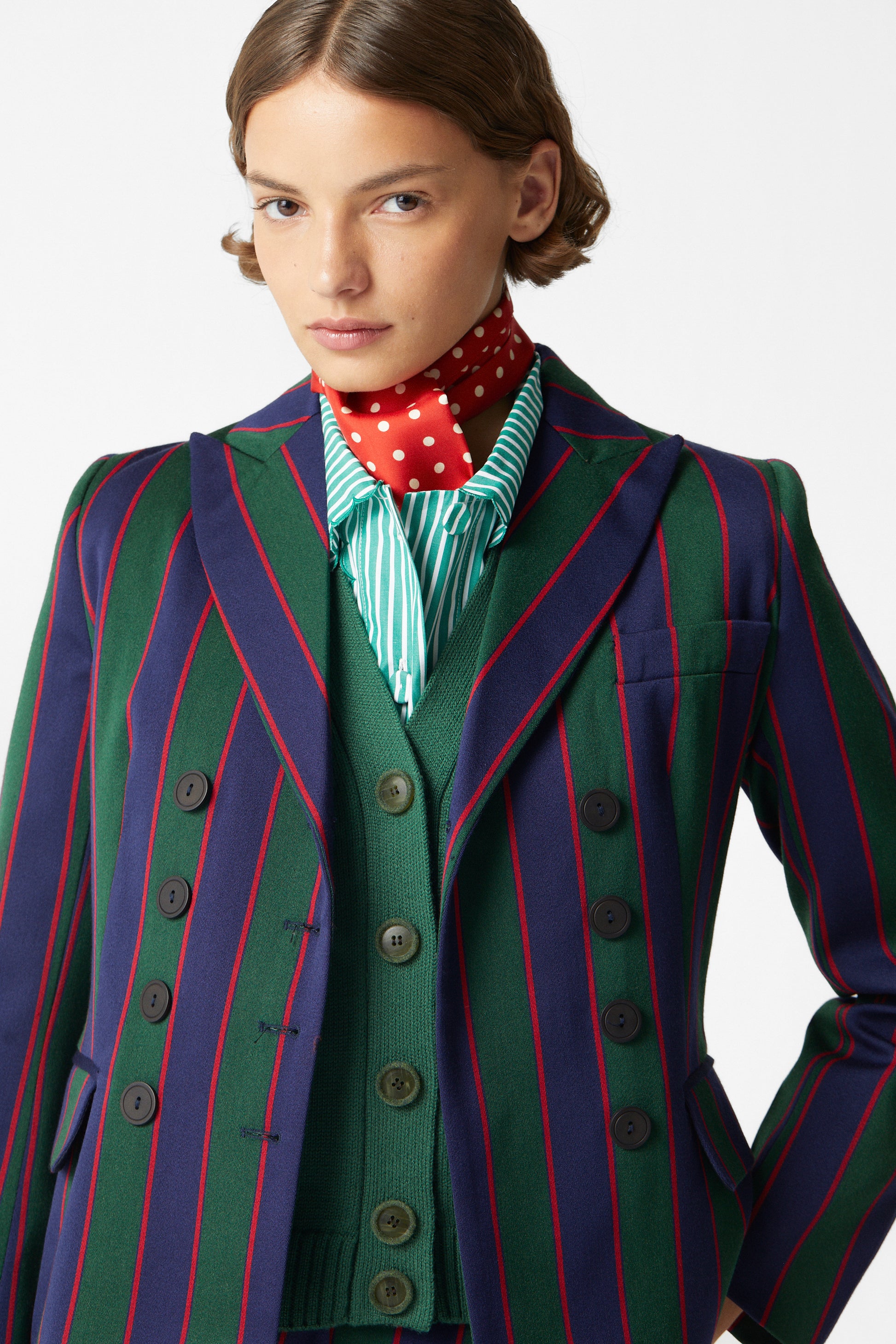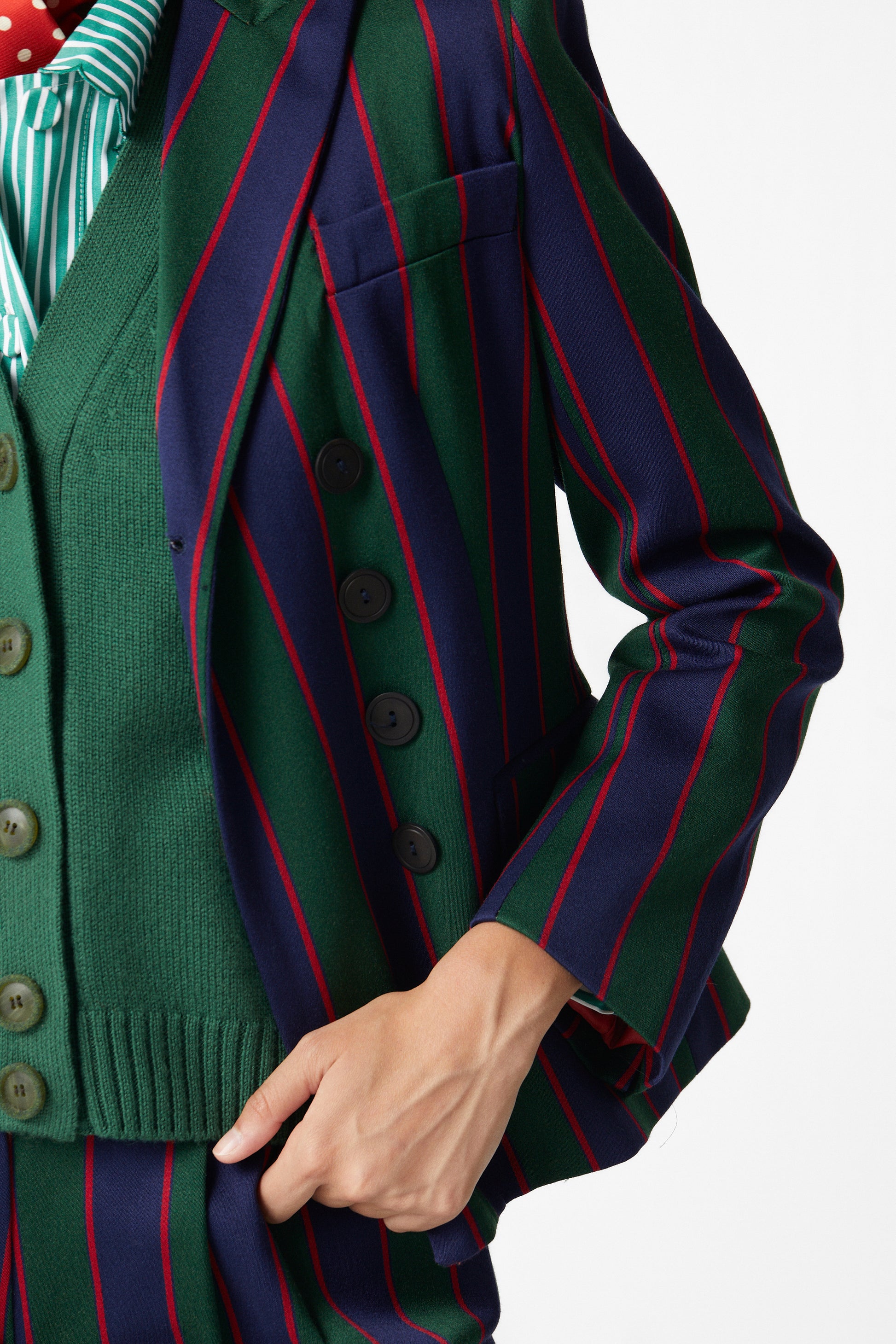Tailored blazer made from a wool blend with vertical green, red, and blue stripes. It features a structured silhouette with six front buttons arranged in two parallel rows. Fully lined with a burgundy striped shirting fabric.