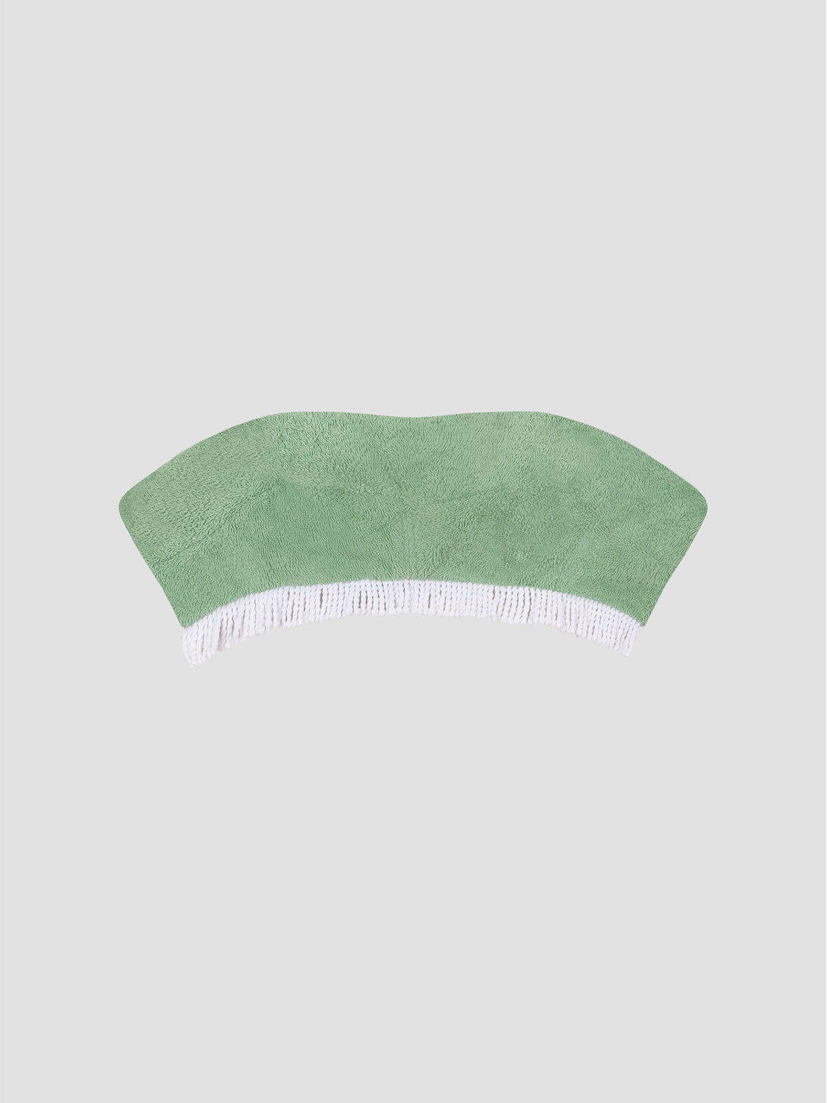 Green towel bandeau top with a tie at the back and fringe detailing.