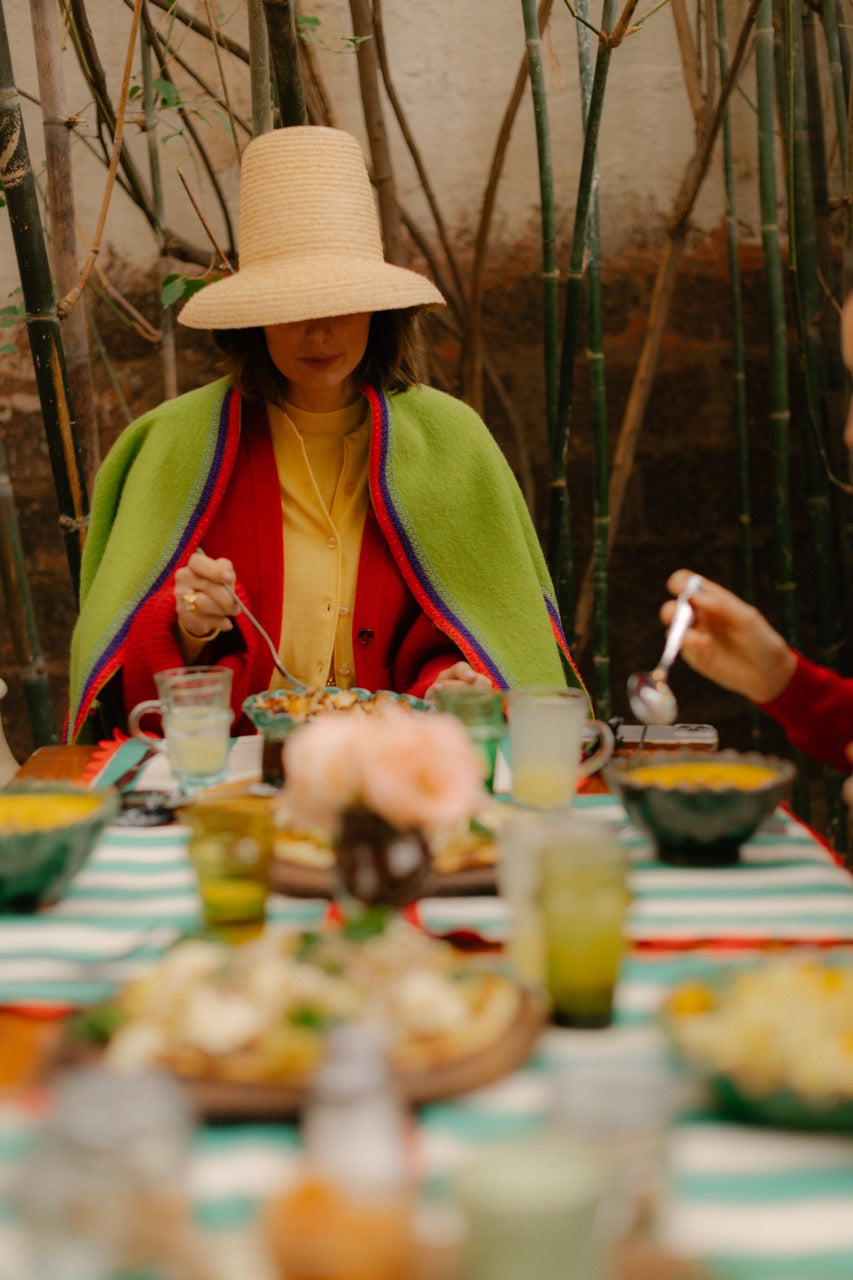 Woolen cape in lime green with multicolor contrast detailing.