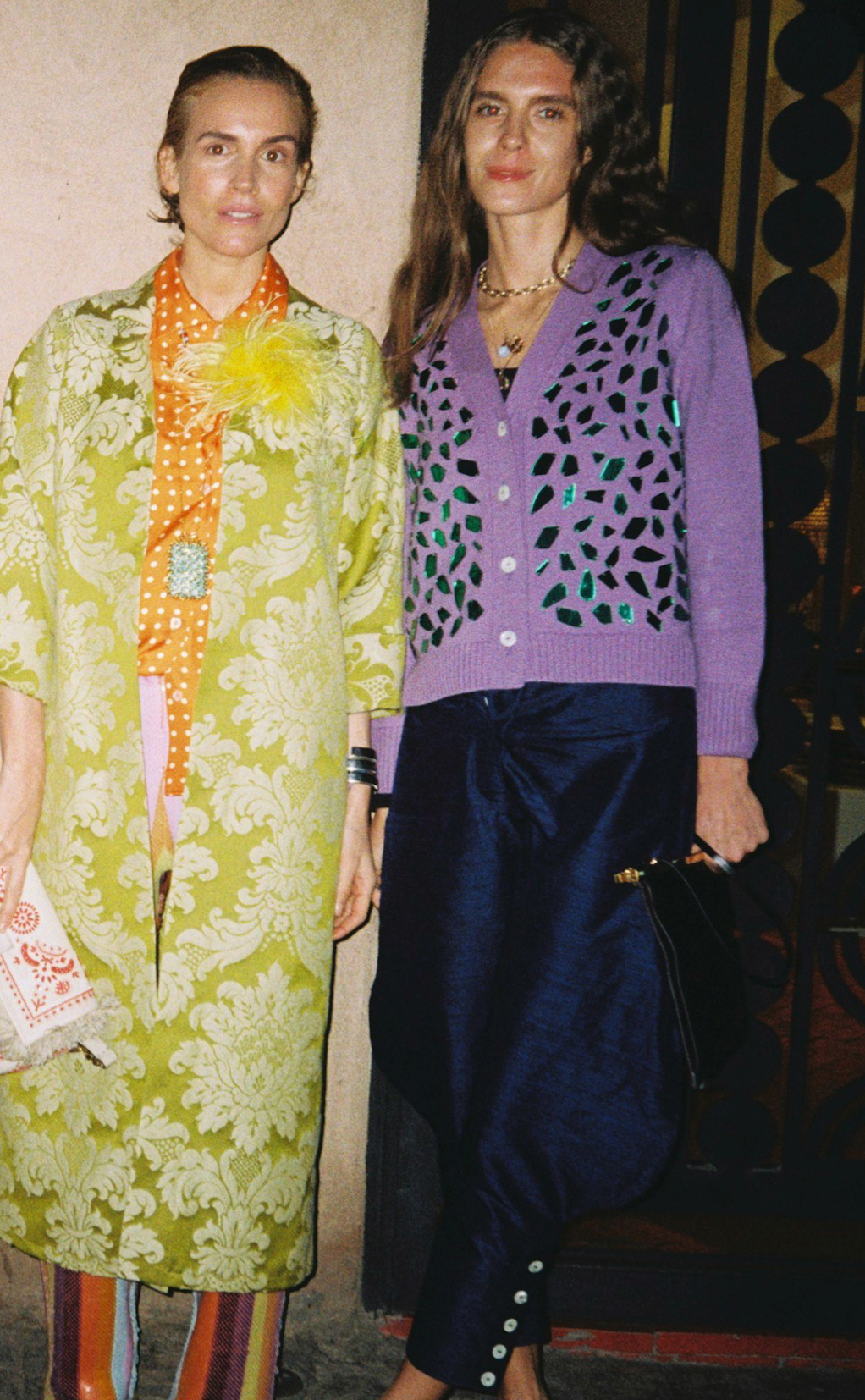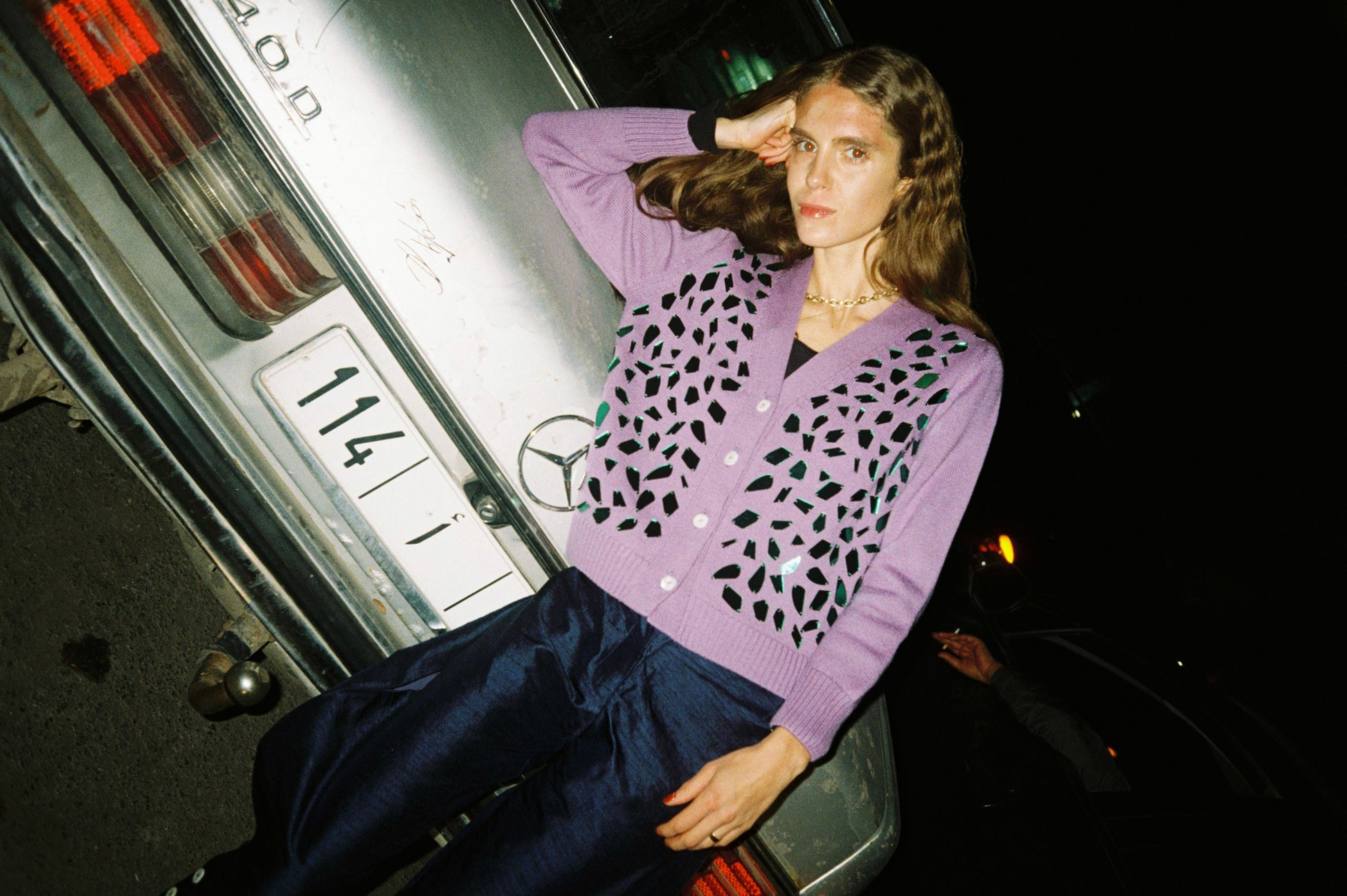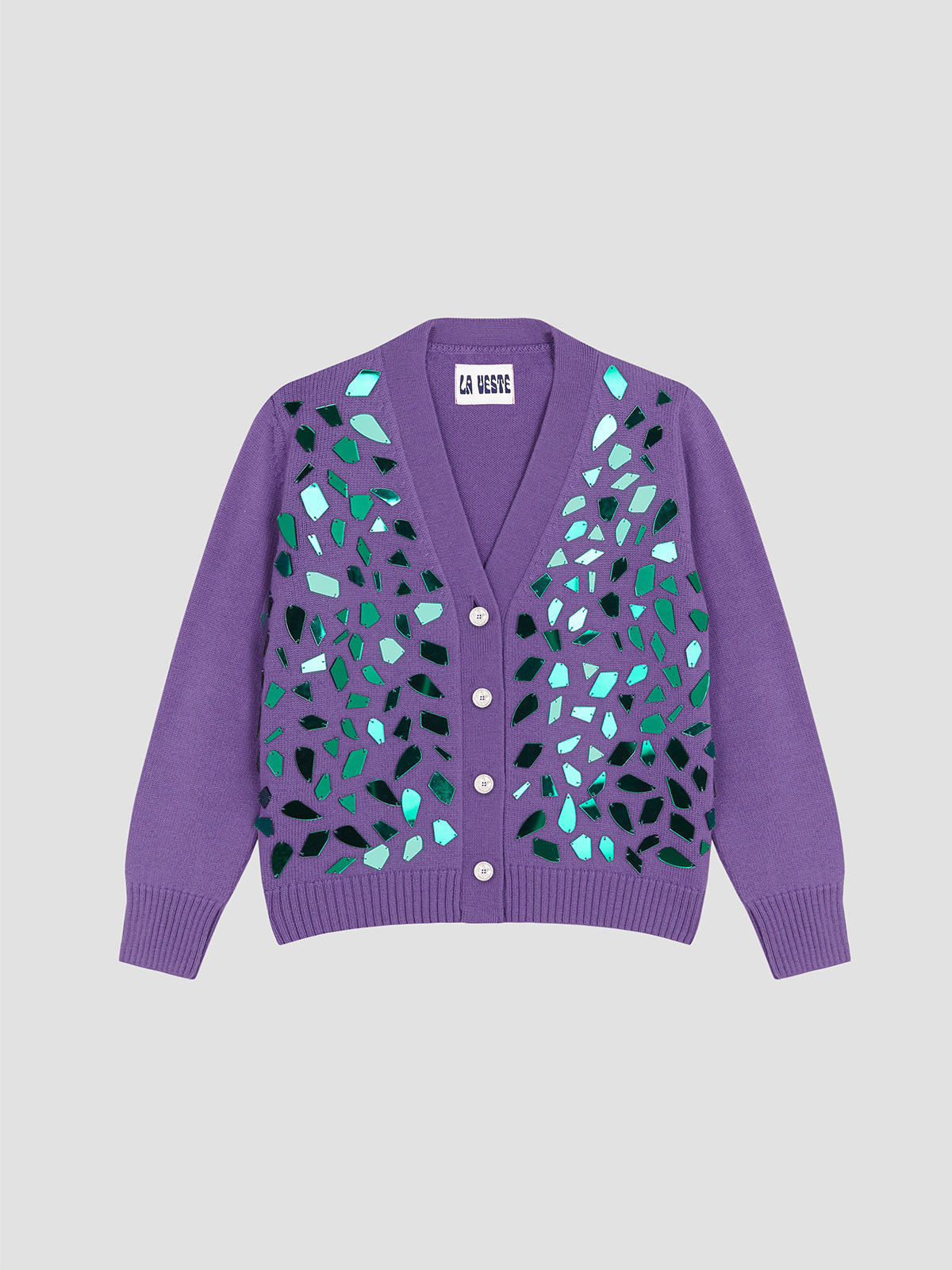 Purple cardigan crafted in wool, featuring a V-neckline and a front button closure. The front panels are embellished with green acrylic crystal appliqués while the sleeves and back remain plain.