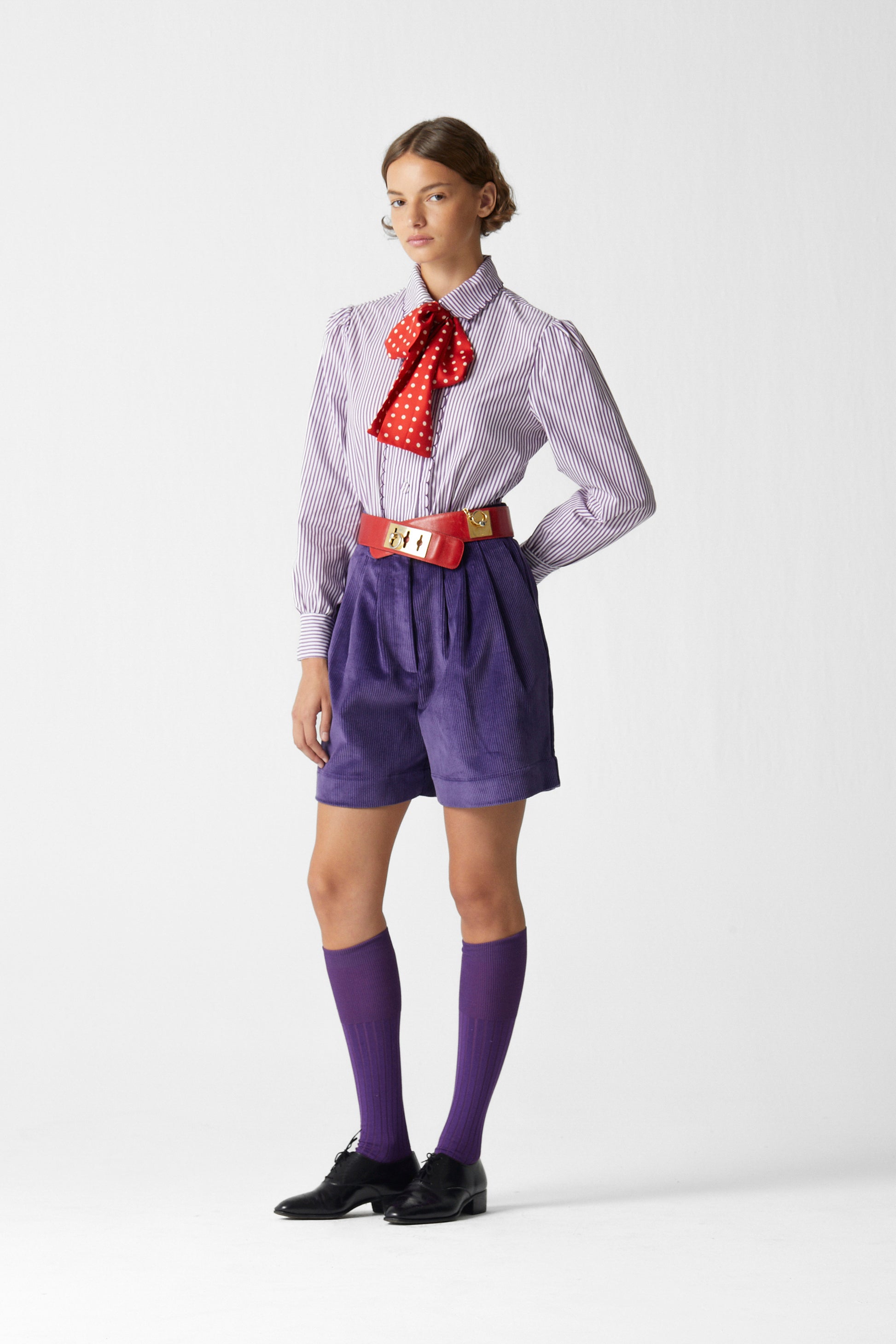 Corduroy Bermuda shorts with a straight cut and pleated front. Designed with two side pockets, belt loops, and a zip-and-button closure.