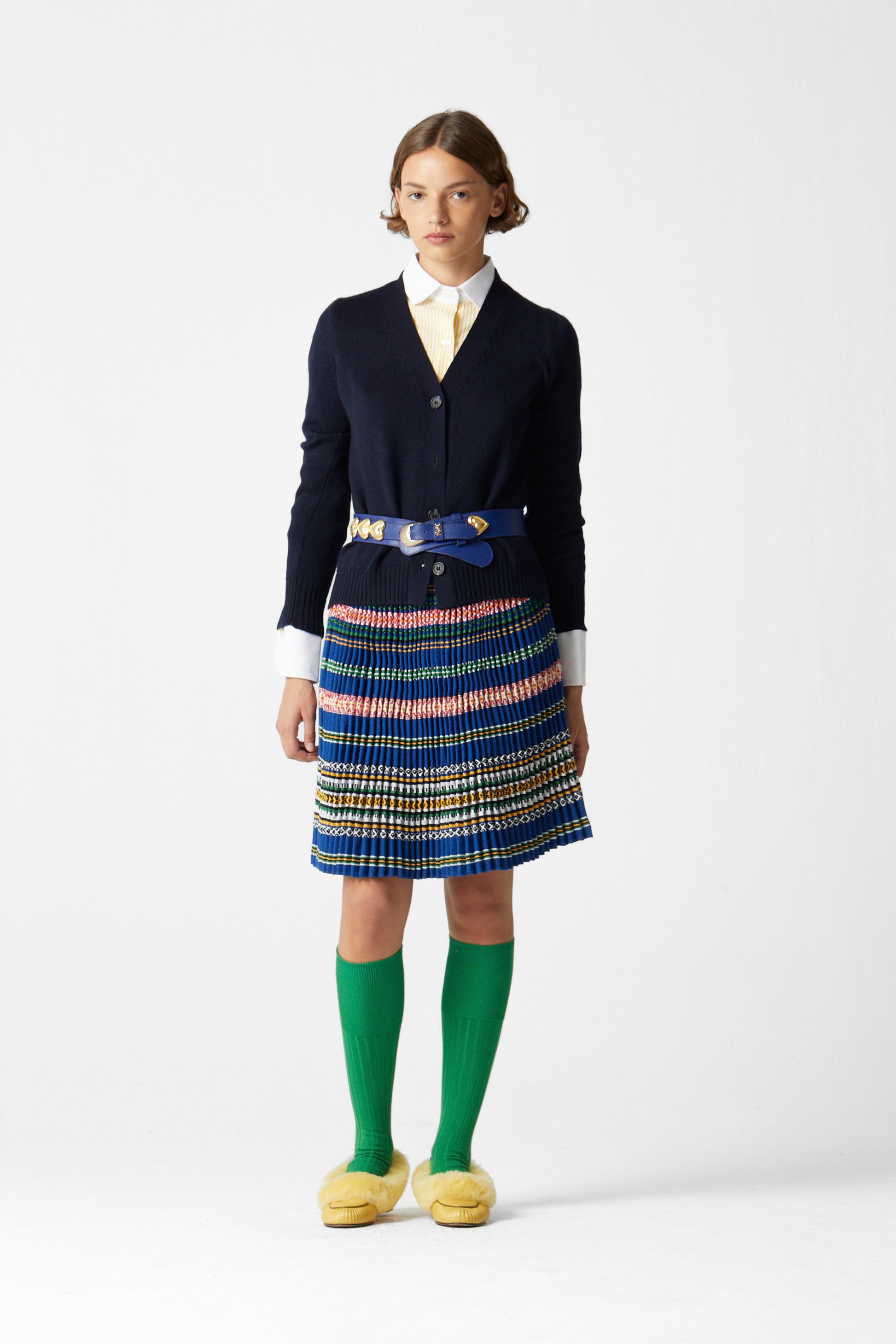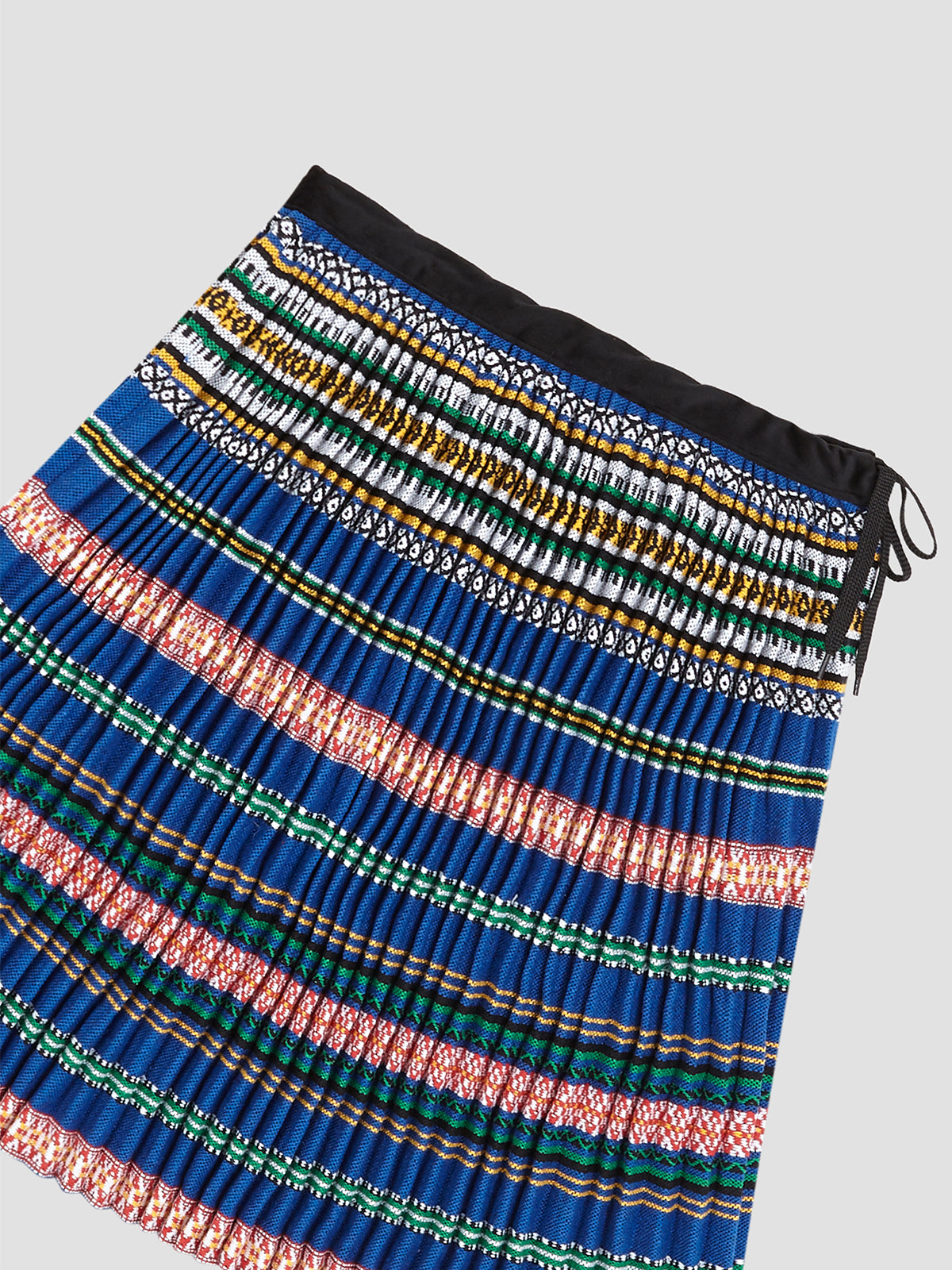 Flared knee-length skirt with pleats, featuring a multicoloured horizontal pattern combining geometric stripes in blue, green, gold, orange, and white.