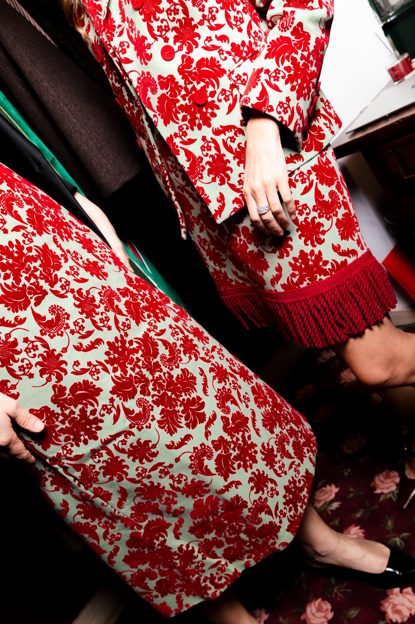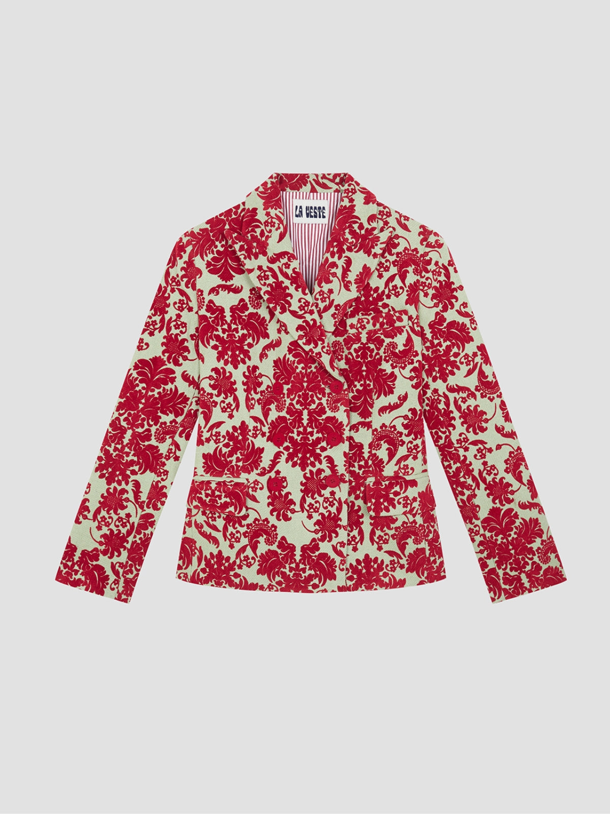 Wool jacket in green with red flocked detailing, featuring a classic collar and six front buttons.