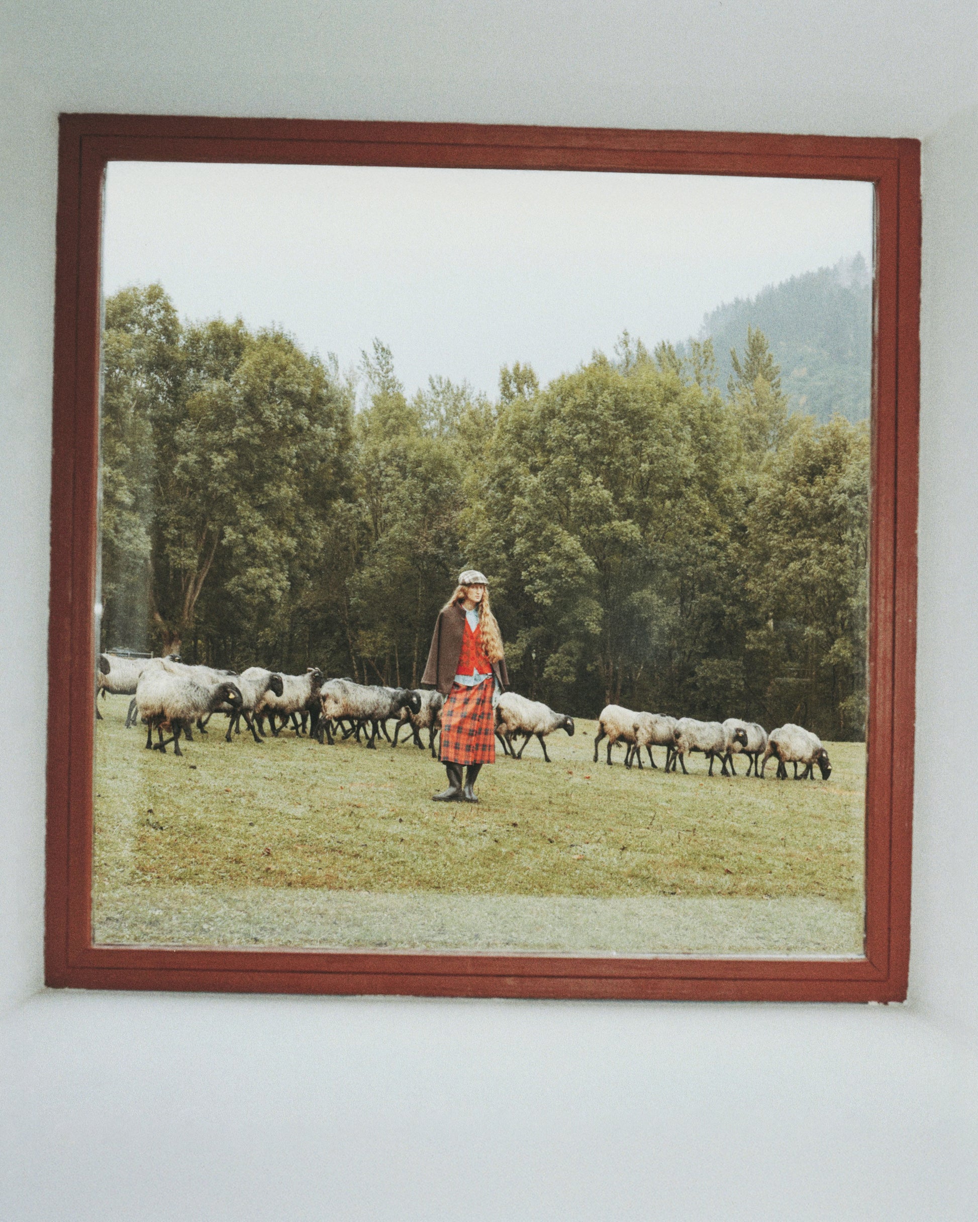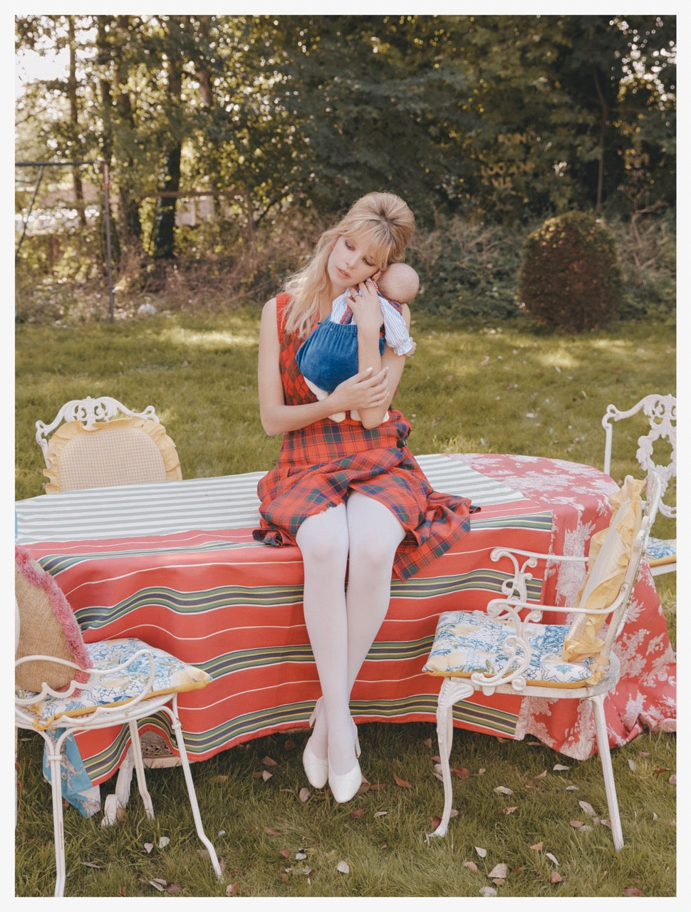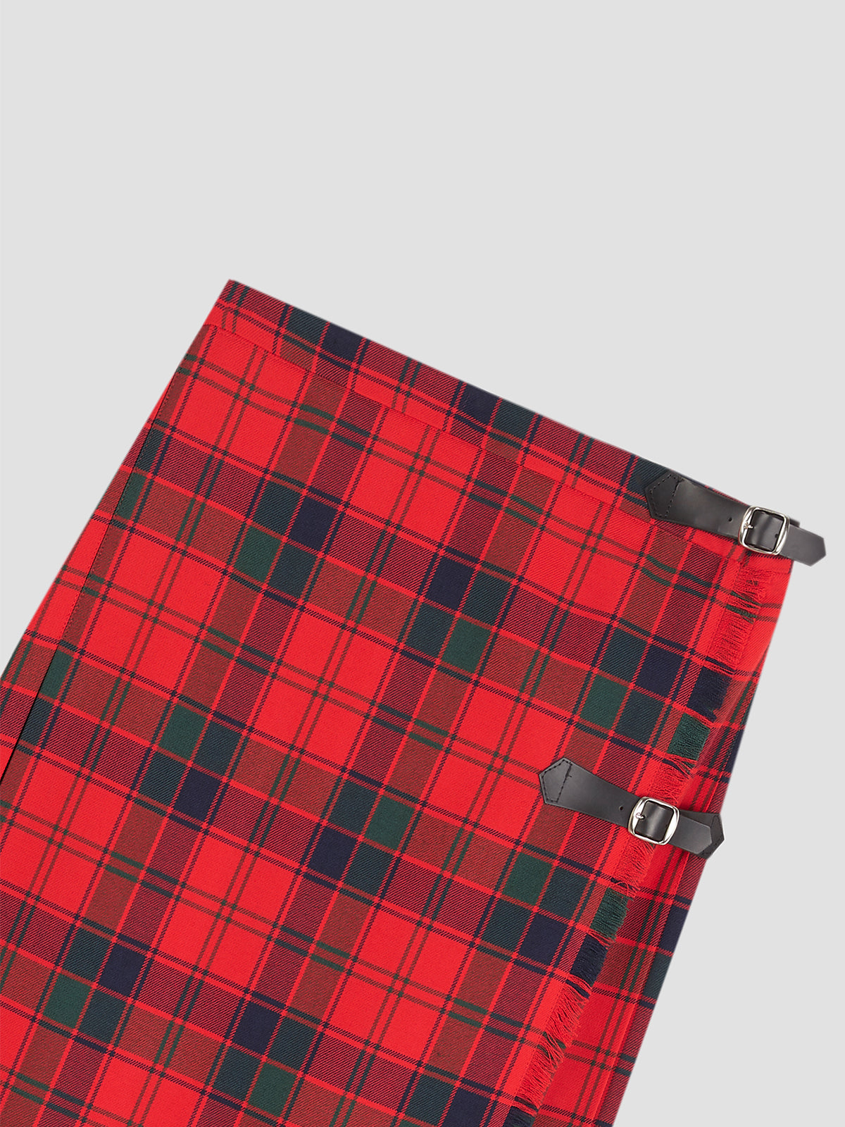 Midi-length red tartan skirt featuring a classic Scottish pattern and two side buckles for closure.