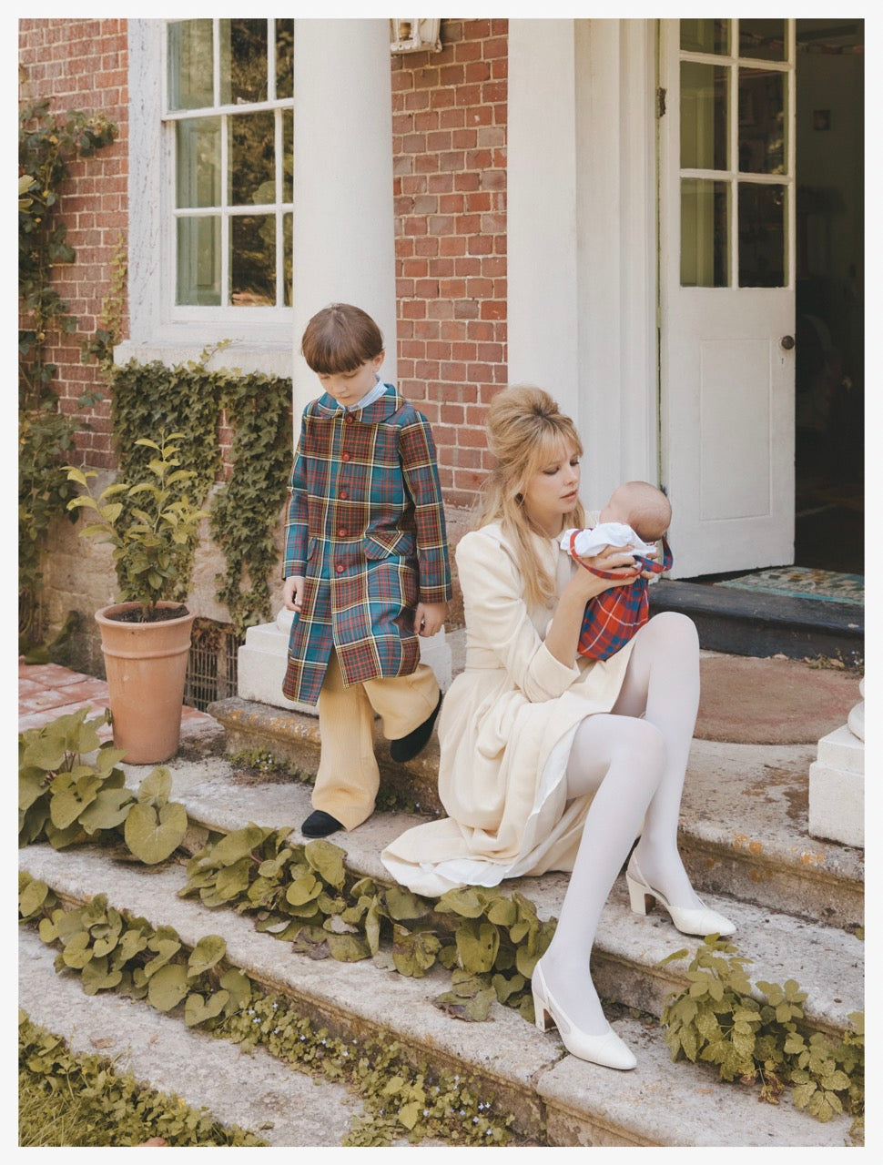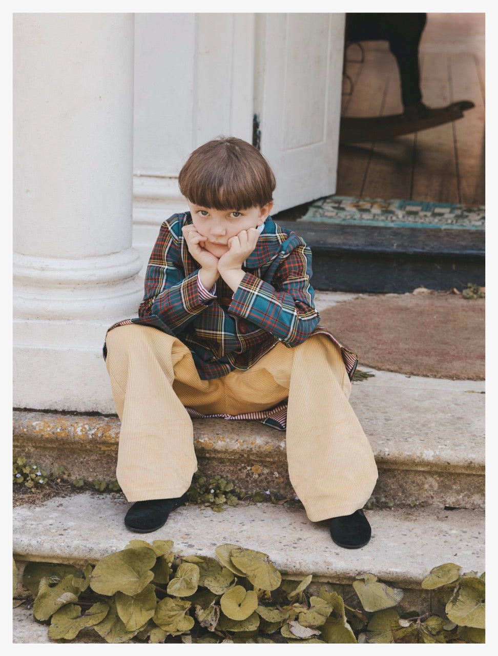 Coat in multicolour tartan with red, green, blue, and yellow checks.