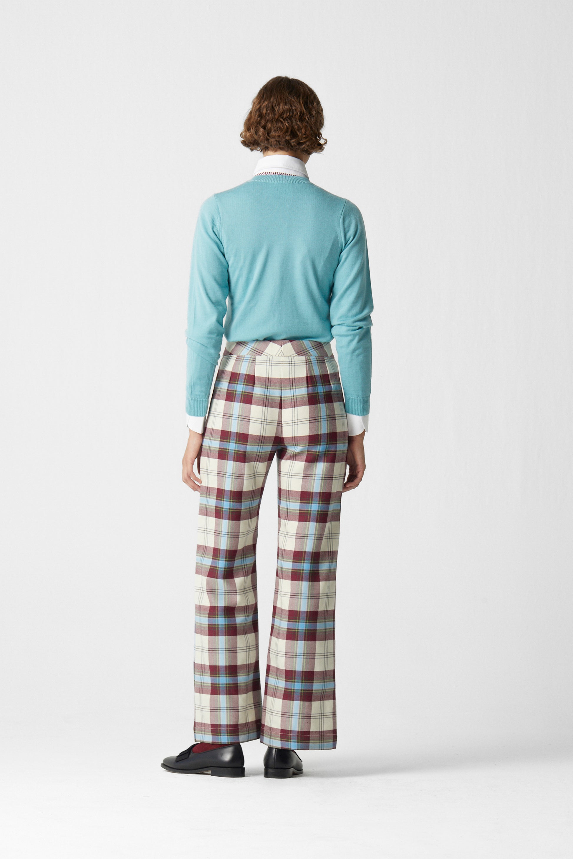 Long trousers with a light blue and burgundy check pattern. Featuring two horizontal buttons at the front for closure and two front pockets.