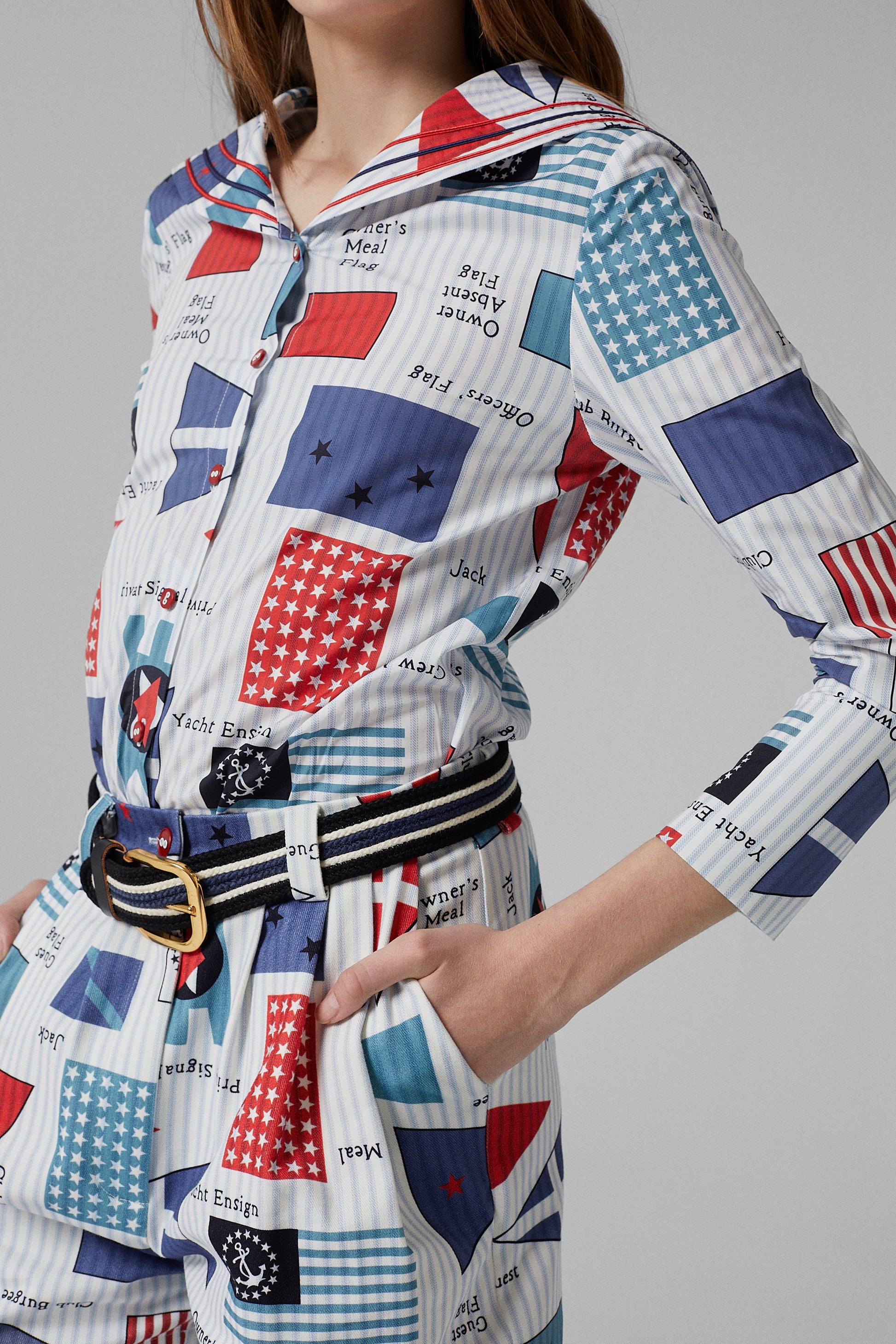 Light blue long-sleeve shirt crafted in cotton, featuring a wide sailor-style collar and a front button closure, decorated with an all-over nautical flag print in red, white and blue tones.