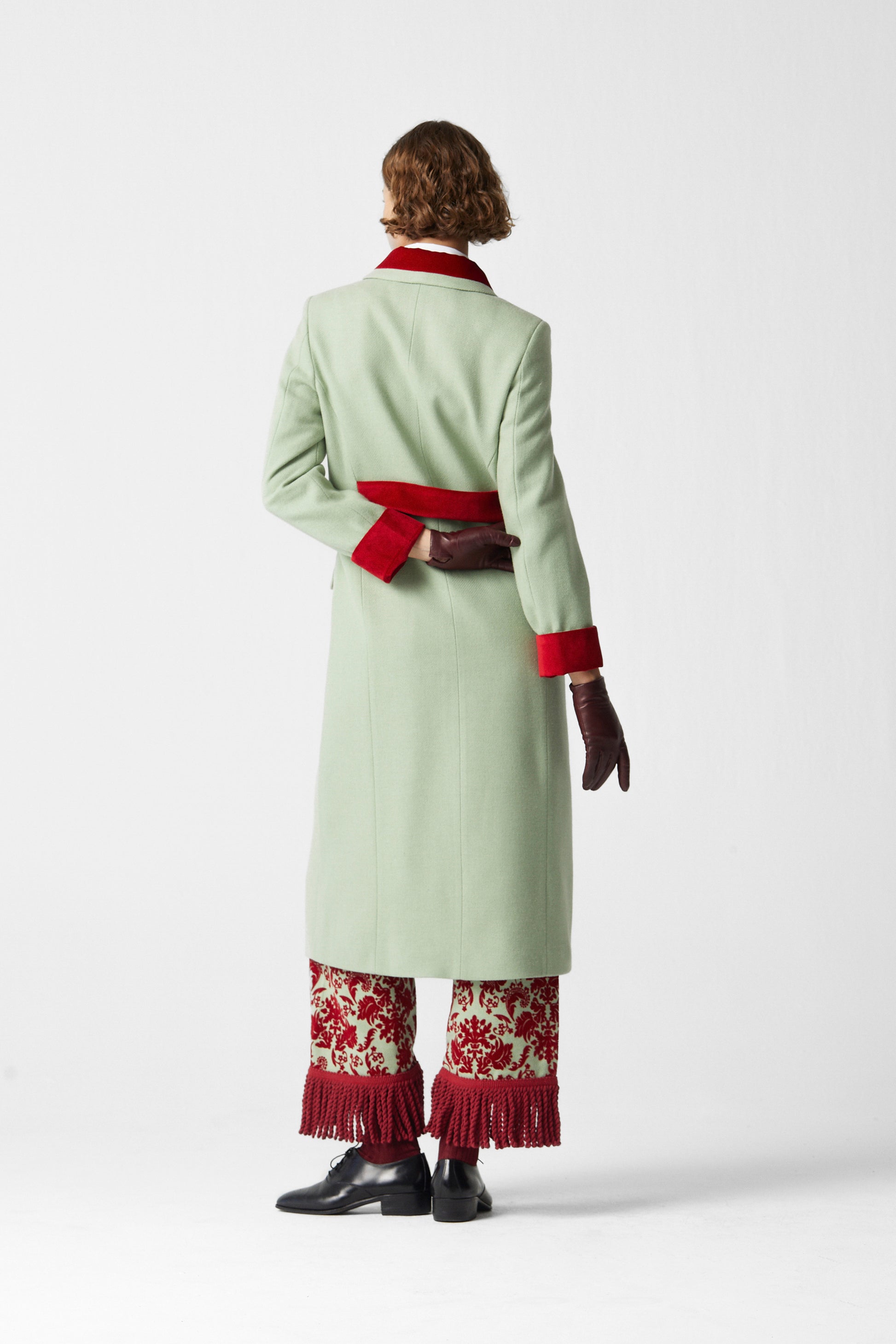 Long wool coat in apple green featuring red velvet details on the collar, cuffs, and a velvet ribbon at the back. Fully lined with burgundy striped fabric, the same as used in the SCHOOL SHIRT 14, adding a distinctive and coordinated interior finish.