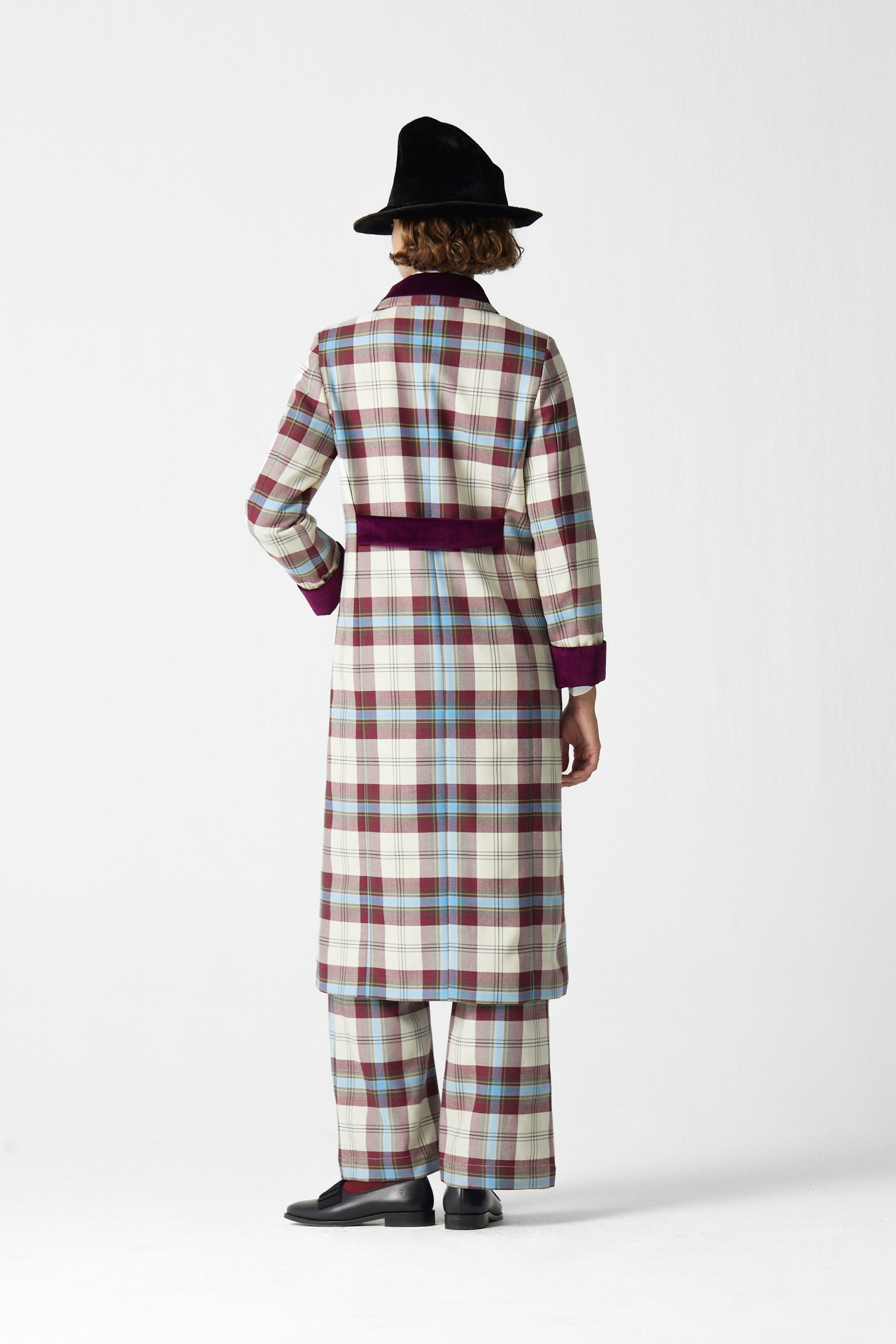Long coat made from tartan fabric in celeste and burgundy tones. Features burgundy velvet details.
