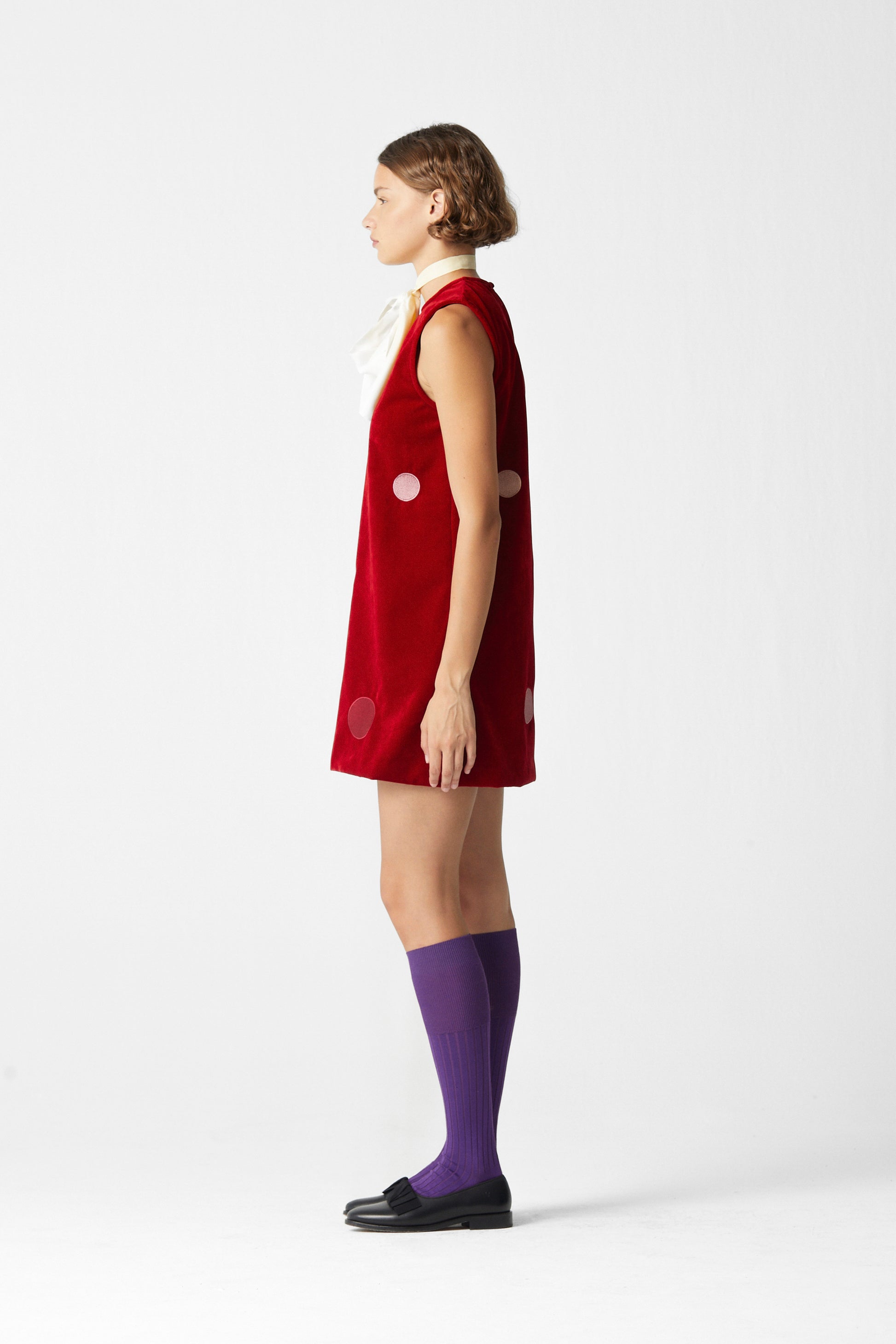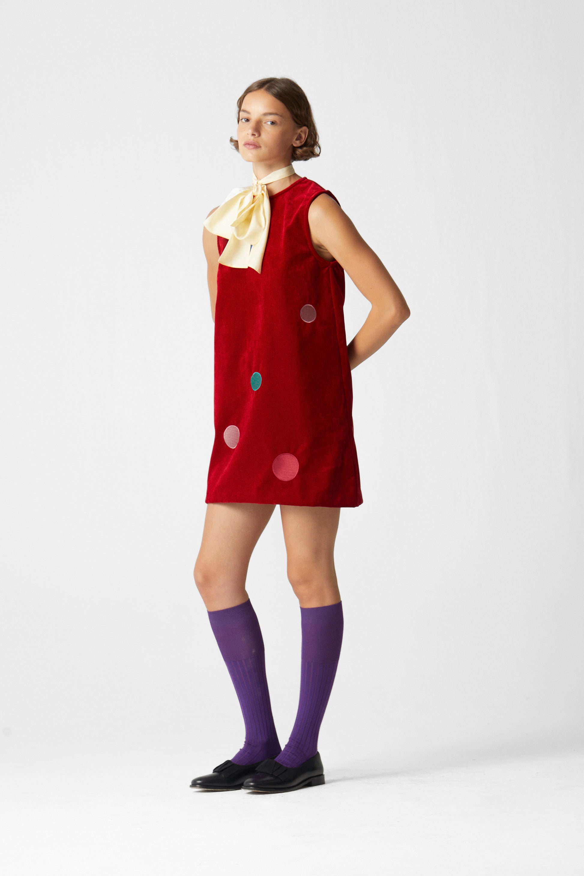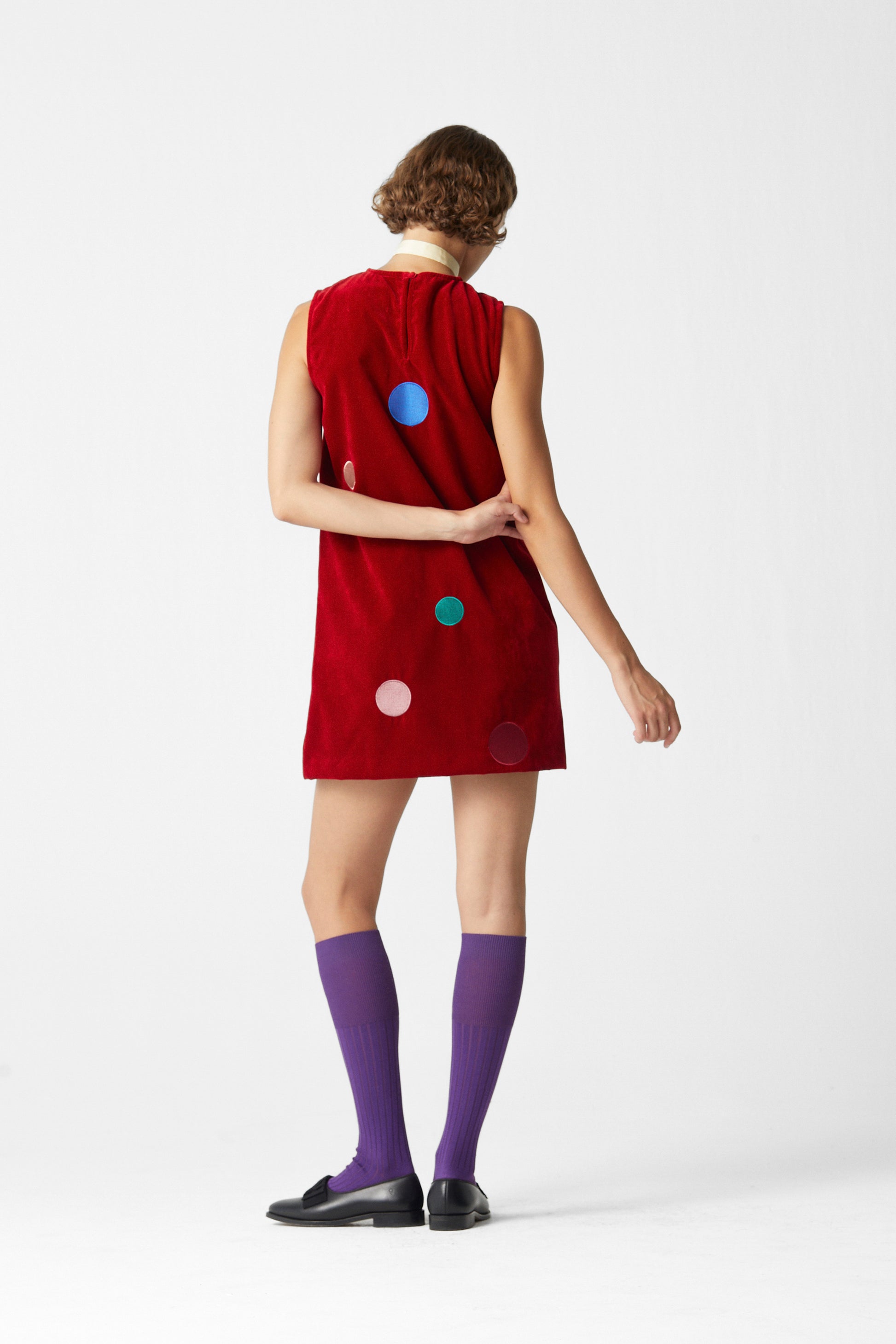 Short velvet dress made in red with multicolor circle embroidery.