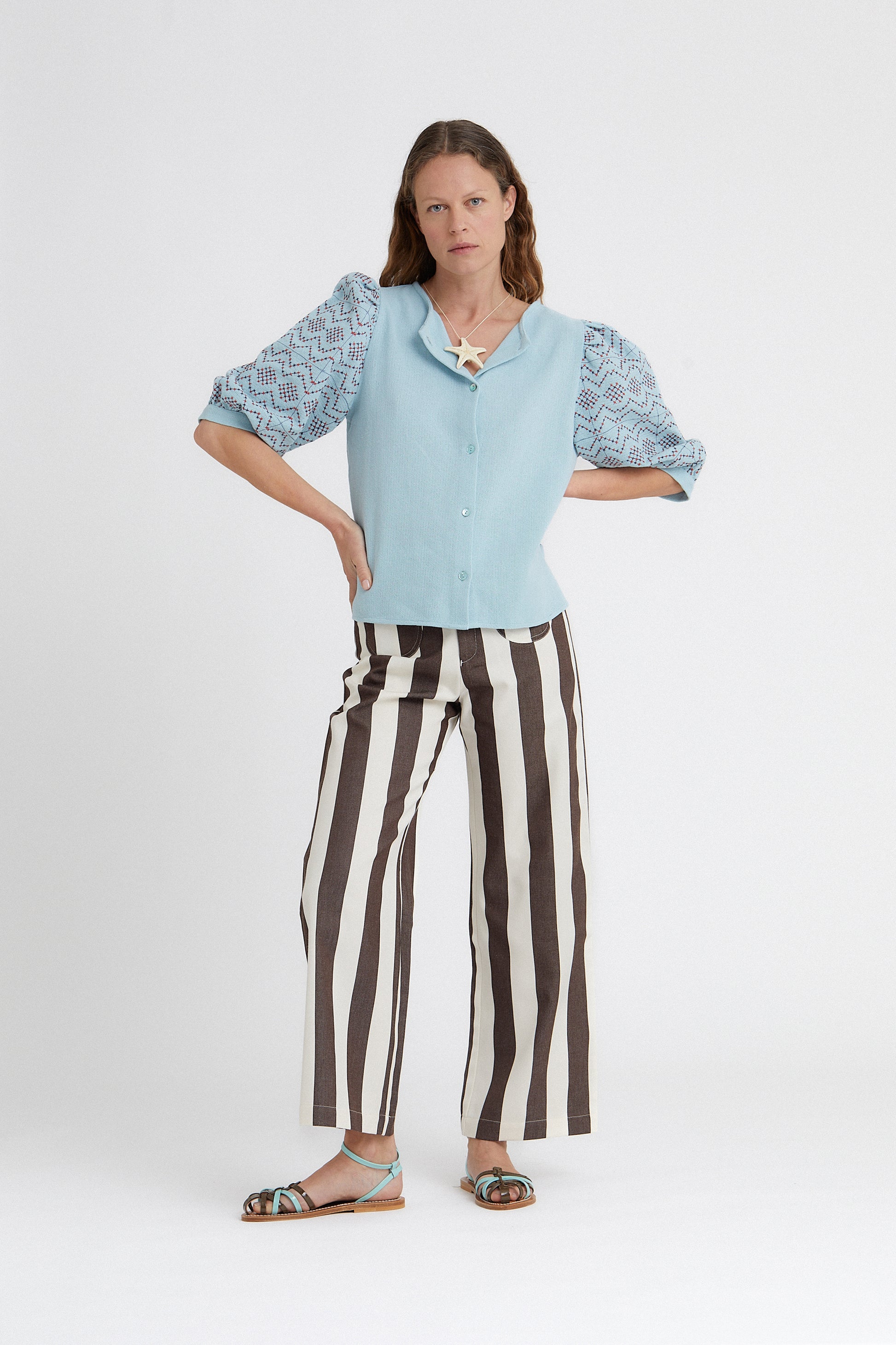 Brown high-waisted trousers printed in cotton with brown and ecru stripes.