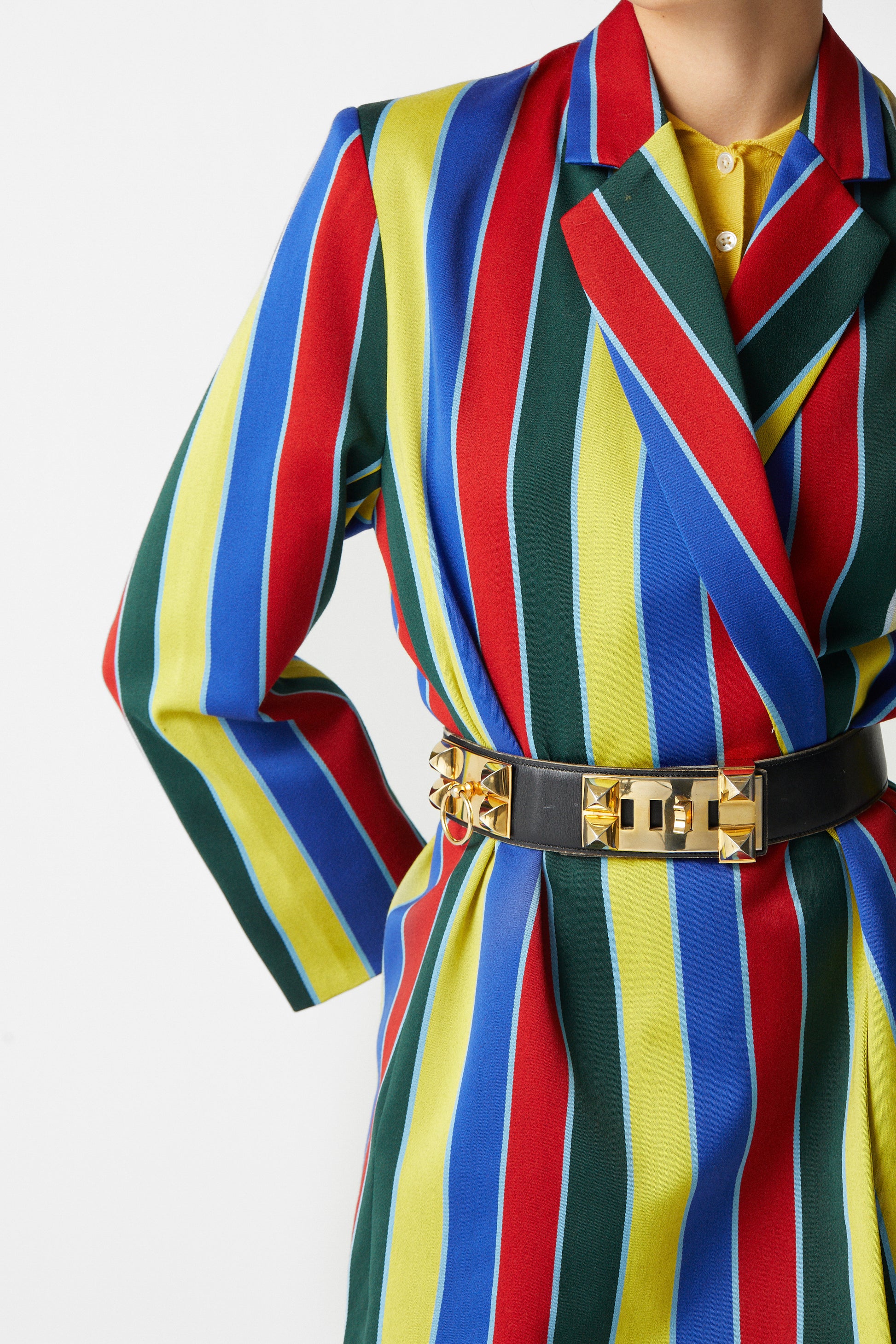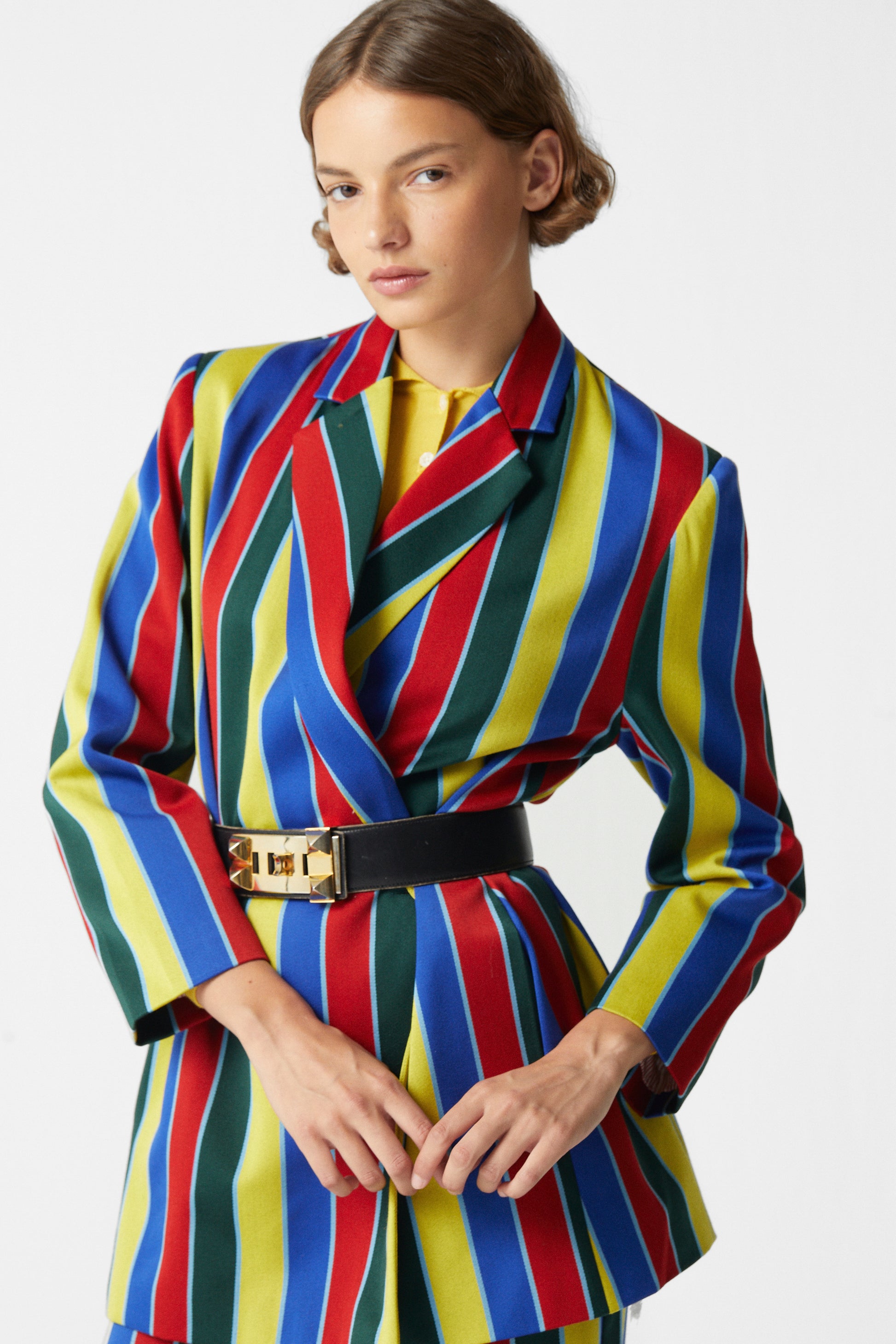 Oversized blazer with a striped pattern in red, navy blue, yellow, and green.