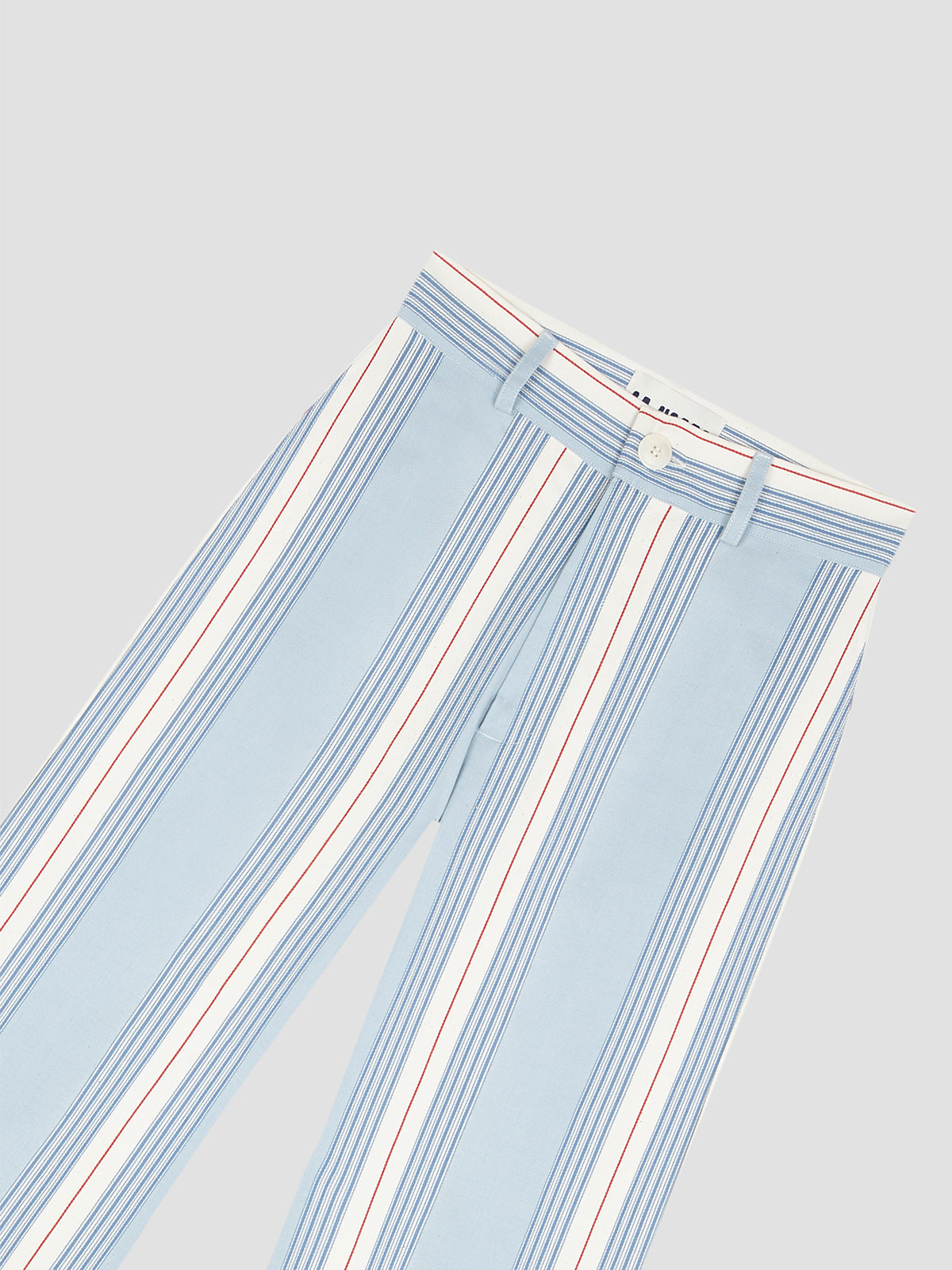 Celeste pants crafted in cotton with vertical blue and red stripes. Pants feature a clean waistband with belt loops, a front button fastening, and a concealed zipper closure.