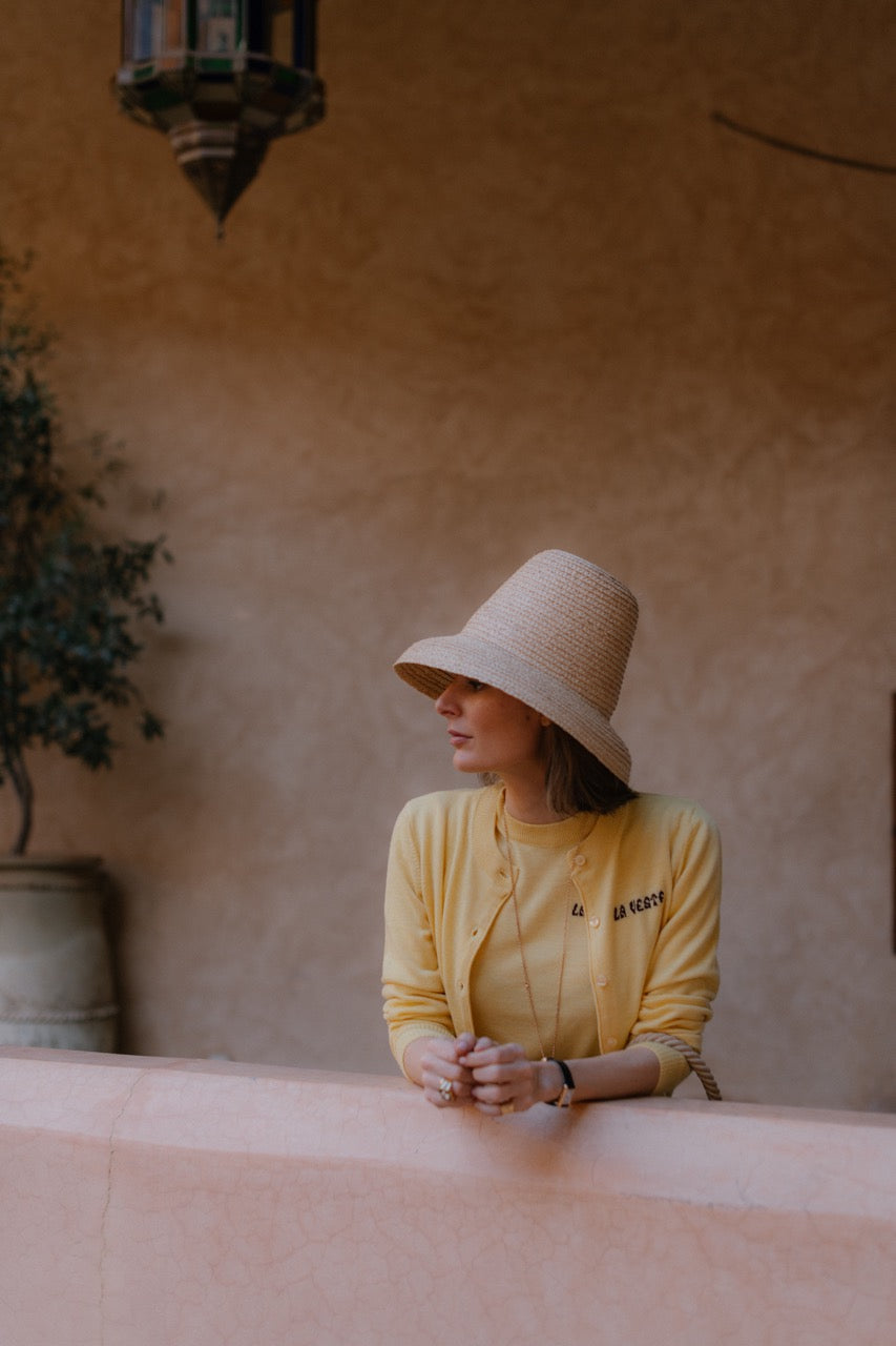 Top in yellow with burgundy “La Veste” embroidery on the chest and button-up front.
